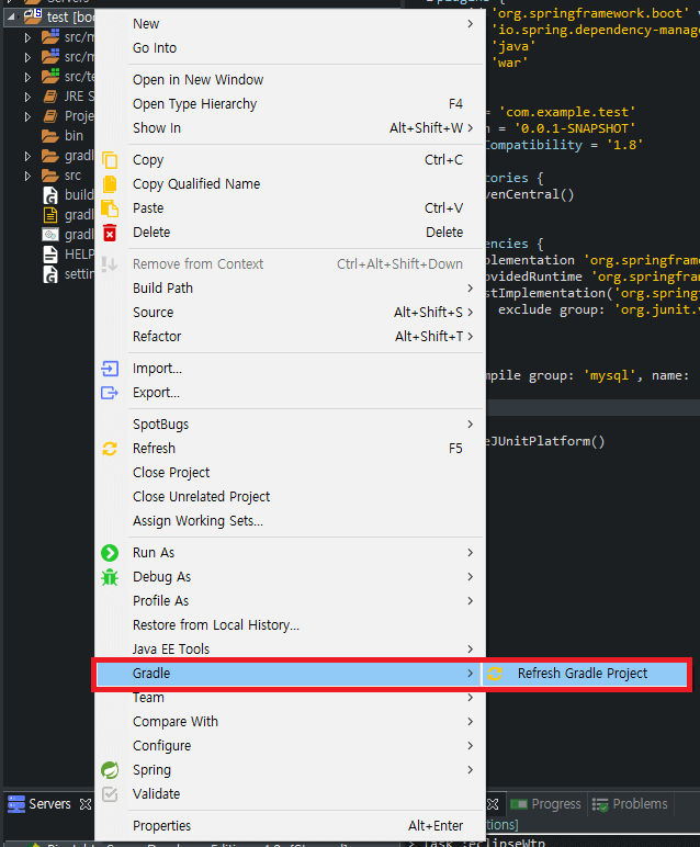 ※ 프로젝트를 마우스 우측 클릭후 gradle → Refresh Gradle Project를 클릭해주세요.