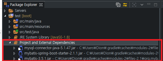 3. 프로젝트의 gradle를 refresh 하면 아래와 같이 dependencies에 Mybatis jar파일이 추가 됩니다.