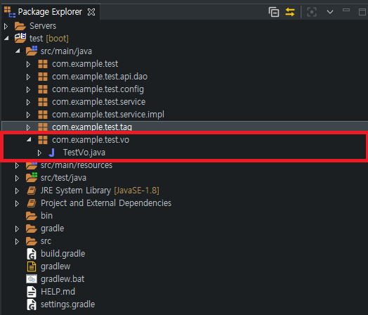 6. 이제 위와 같이 설정을 하셨으면 위에 명시된 Vo패키지에 Vo를 하나 만들어 줍니다.(각자 프로젝트에 맞게 Vo 패키지를 명시 하시면 됩니다.)